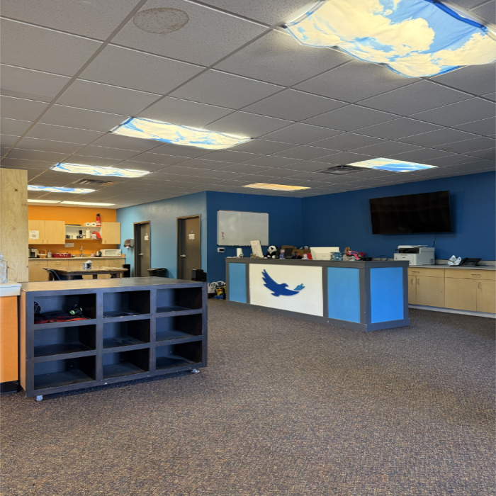 The Mary Peterson Community Room, named in honor of one of Eagle Mount’s past executive directors, is a welcoming space designed for connection and collaboration. Perfect for meetings, trainings, seminars, conferences, or celebrations, it comfortably seats over 75 people and features a large flat-screen smart TV, rolling accessible tables, and flexible seating. An adjoining adaptive kitchen makes it easy for staff, participants, and guests to cook, share meals, and enjoy time together.